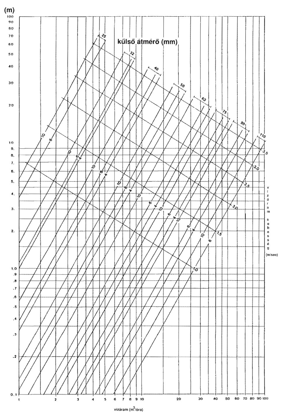 Az időigényes számítások elvégzése helyett egyszerűbb az 4.4.1 számú ábrát használni (amely a gyakorlat számára elegendő pontosságot ad), ahol a szükséges vízszállítás és kiválasztott sebesség mellett leolvasható a megfelelő nyomásfokozatú KPE cső külső átmérője, valamint a nyomásveszteség értéke. Látható, hogy azonos átmérő mellett az emelkedő nyomásfokozatok növekvő veszteséget mutatnak. Ez az eltérő falvastagságból adódik, a nyomásfokozattal nő a csőfal vastagsága, ezzel csökken a belső keresztmetszet.