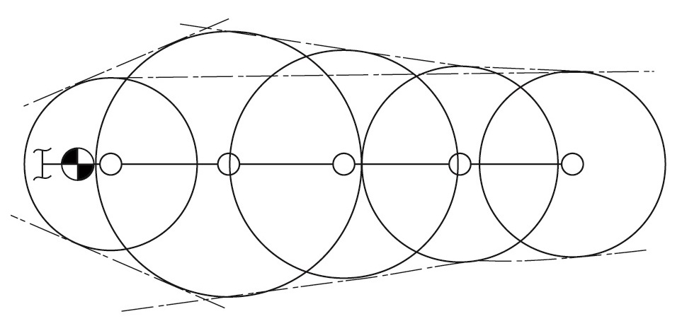 A 4.4.3 számú ábrán egy elméleti szórási átmérő változás látható. Az első szórófej közel van a szerelvényekhez, ahol a víz áramlása még erősen örvénylő, a fúvókán kijutva a víz rövidtávon a földre hull. A távolabbi szórófejek esetén a nyomás és ezzel együtt a szórási távolság is csökken.