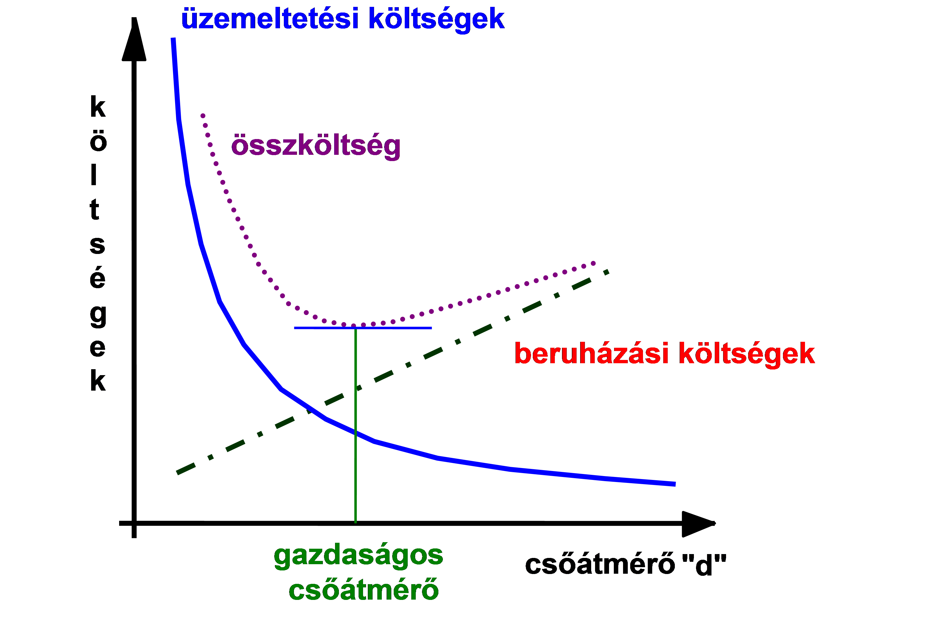 4.4.5 ábra. A beruházási, az üzemeltetési és az összköltség figyelembevételével megadott gazdaságos csőátmérő