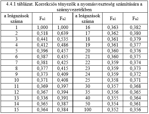 4.4.1 táblázat. Korrekciós tényezők a nyomásveszteség számítására a szárnyvezetékben