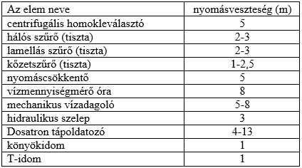 4.4.3 táblázat. Csőhálózatok kiegészítő elemeinek, idomainak tájékoztató nyomásvesztesége (m)